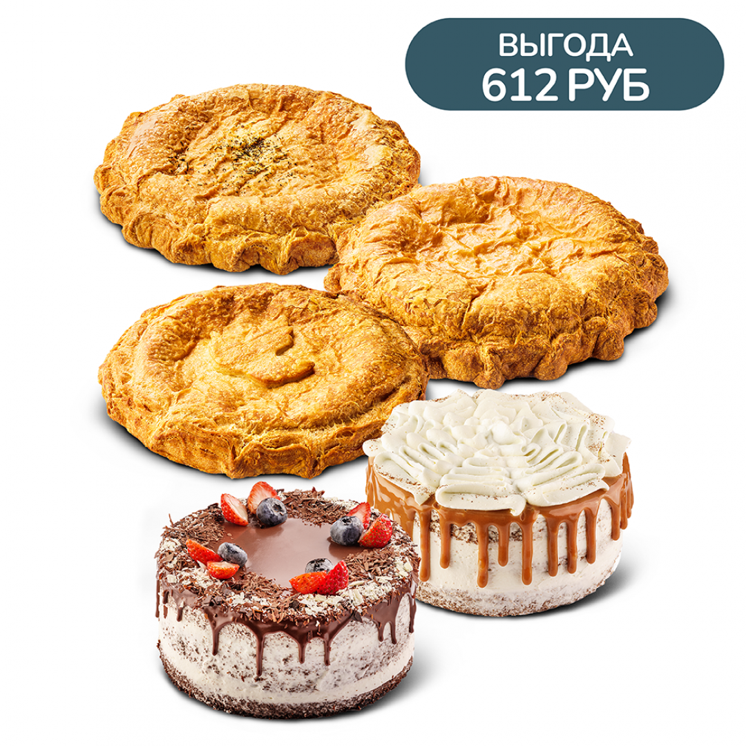 Торт Сицилийский (10 кусочков), Курник со шпинатом на слоеном тесте (4 кусочка), Пирог картофельно-мясной с грибами на слоеном тесте (4 кусочка), Капустник на слоеном тесте (4 кусочка).